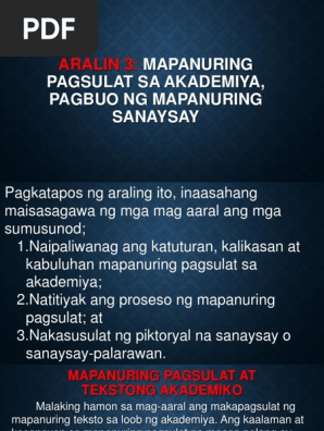 MAPANURING PAGSULAT AT TEKSTONG AKADEMIKO Rochelle S. Contextual translation of mapanuring into English. Katangian ng mapanuring pagbasa Pananaliksik at kaalamang masusing sinuri upang patunayan ang batayan ng katuwiran dito.