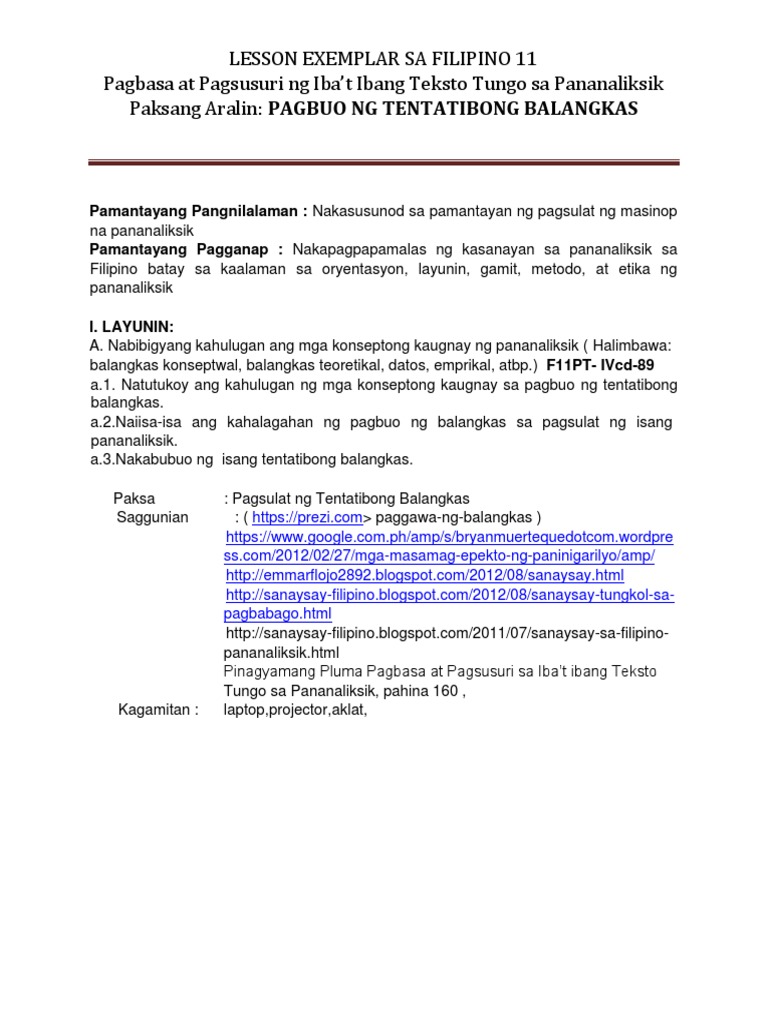 0 Full PDFs related to this paper. Lesson 15 Pagsulat ng Tentatibong Balangkaspdf. View PAGBUO NG TENTATIBONG BALANGKASpptx from BIOL 1103H at University Of Georgia.