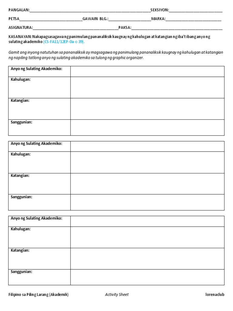 5 uri ng Graphic Organiser. Tunguhin Nilalaman Batayang Balangkas ng Filipino Curriculum K-12 Camille Panghulan. Magsagawa ng panimulang pananaliksik kaugnay ng kahulugan at katangian ng napiling limang uri ng Akademikong Sulatin sa tulong ng graphic organizer.